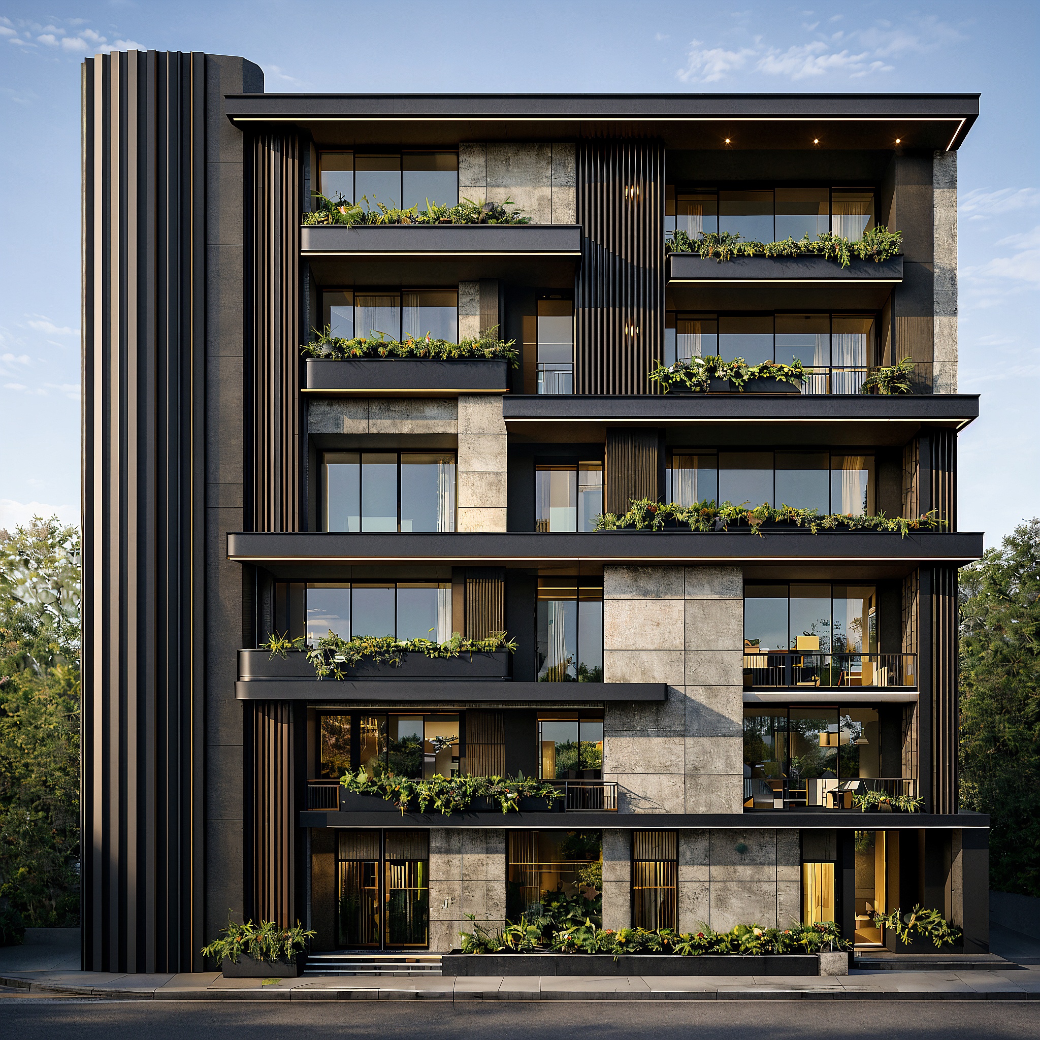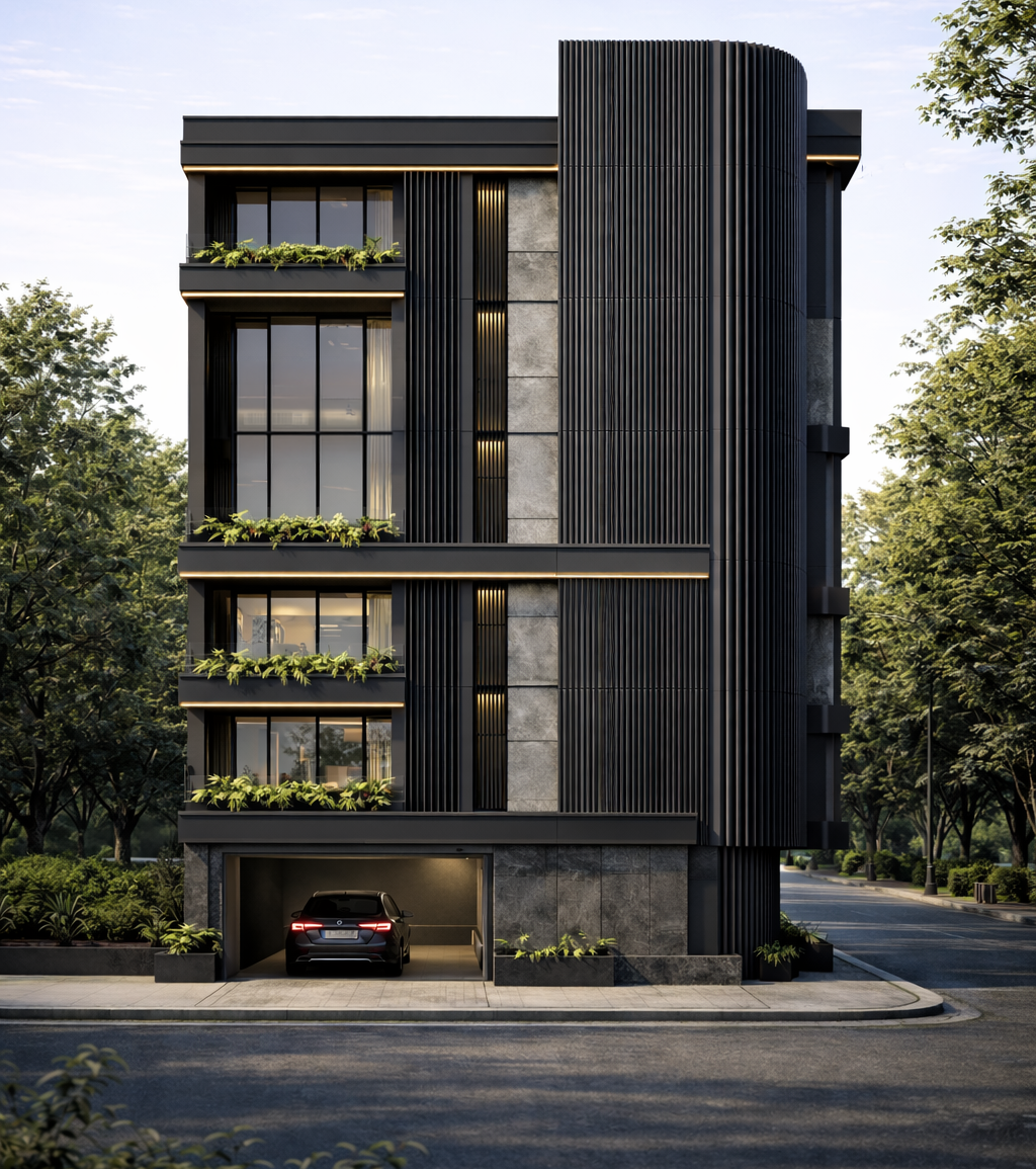 The façade design and development for a renowned Advocate’s residence is an exercise in precision and discretion, reflecting the client’s professional identity through a boutique architectural lens. Utilizing a palette of natural stone, textured concrete, and high-performance glazing, the design emphasizes permanence and tactile quality. Beyond aesthetics, the façade actively manages thermal comfort via layered skins and recessed windows. Balconies are treated as carved volumes rather than projections, maintaining a coherent vertical composition. This architecture of restraint avoids excess, resulting in a composed, enduring presence defined by clarity, deliberate proportions, and a seamless fusion of performance and identity.
