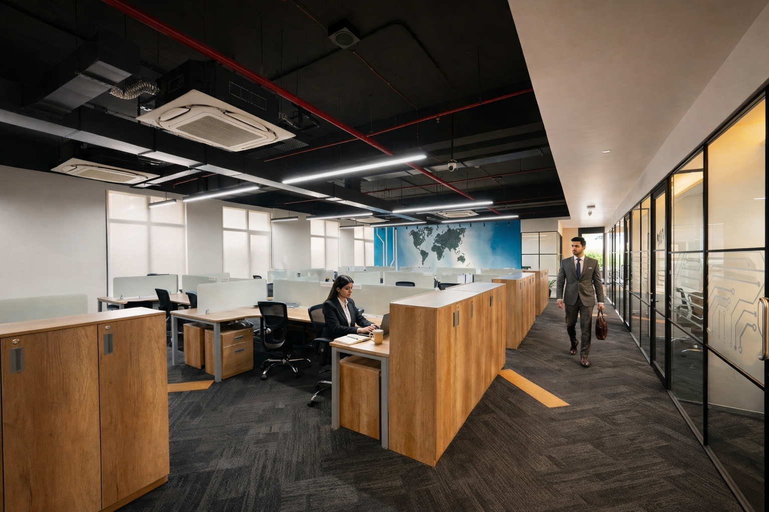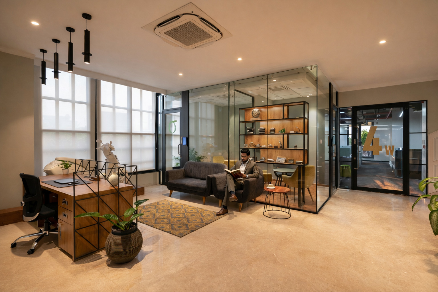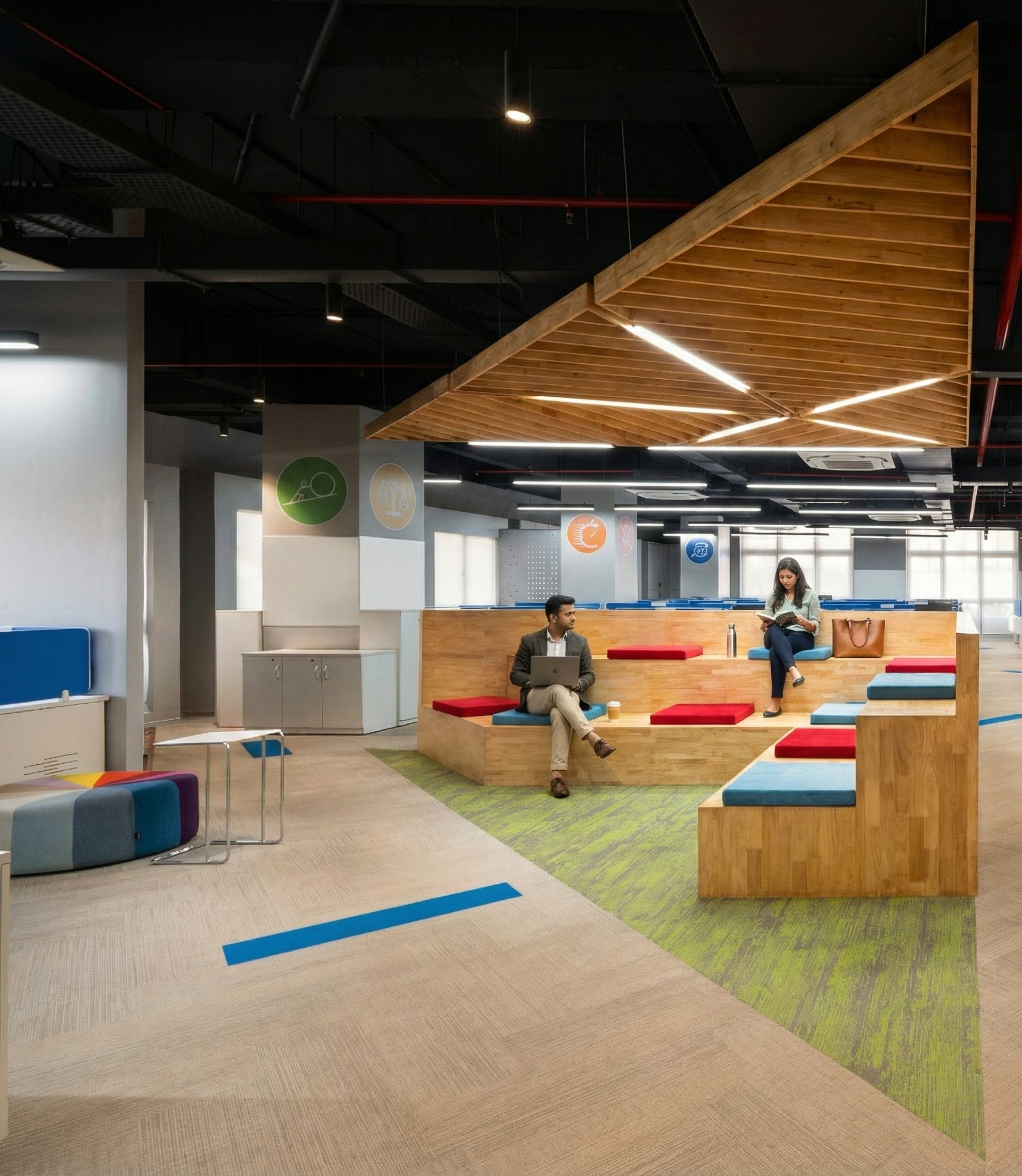 Sustainable materials such as LVT flooring and IGBC-certified finishes contribute to environmental responsibility, supported by VRV air-conditioning systems, LED lighting, and daylight harvesting strategies. Integrated automation within boardroom lighting and AV systems enhances functionality, while extensive writable surfaces across workstations and meeting rooms encourage creativity and technical problem-solving.