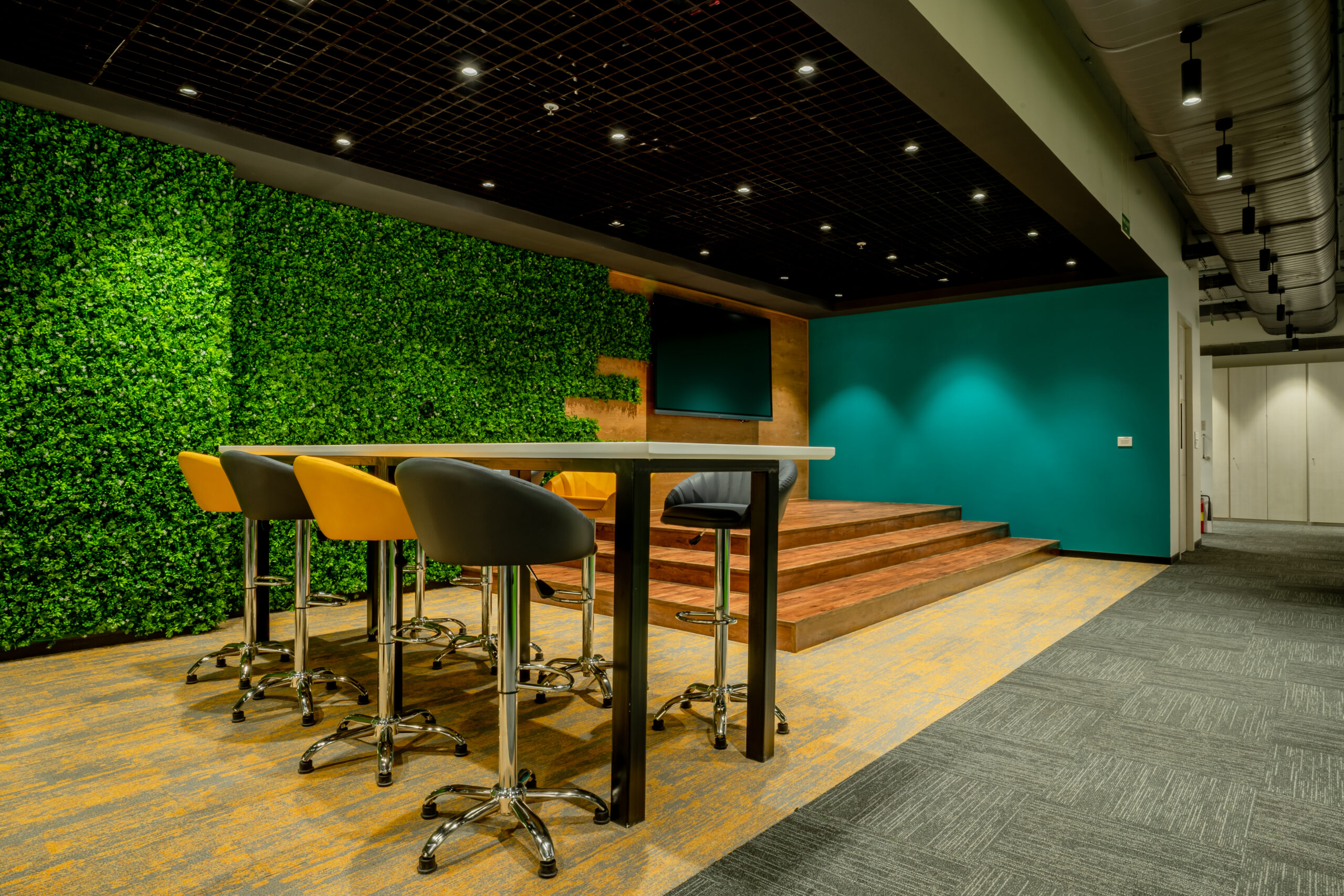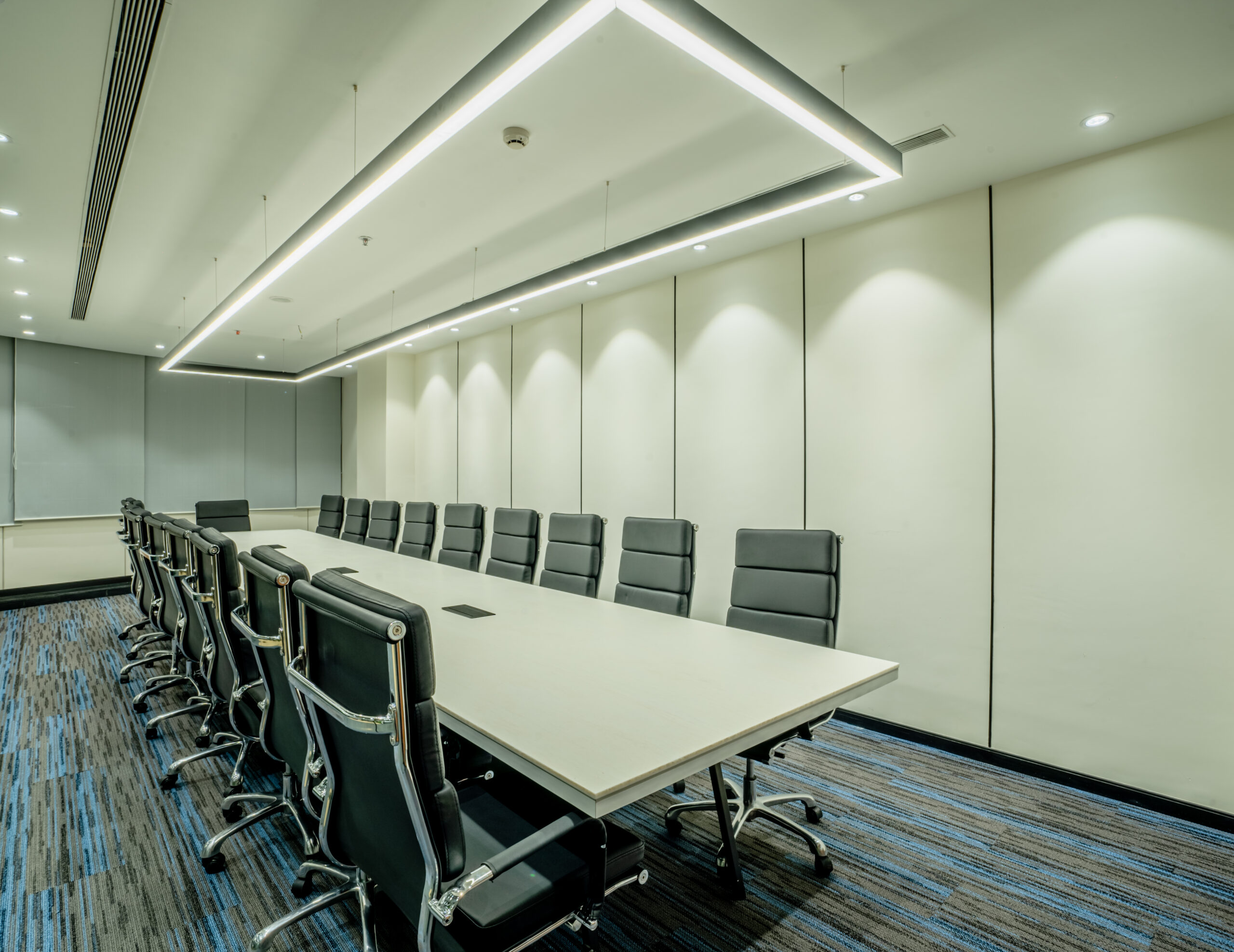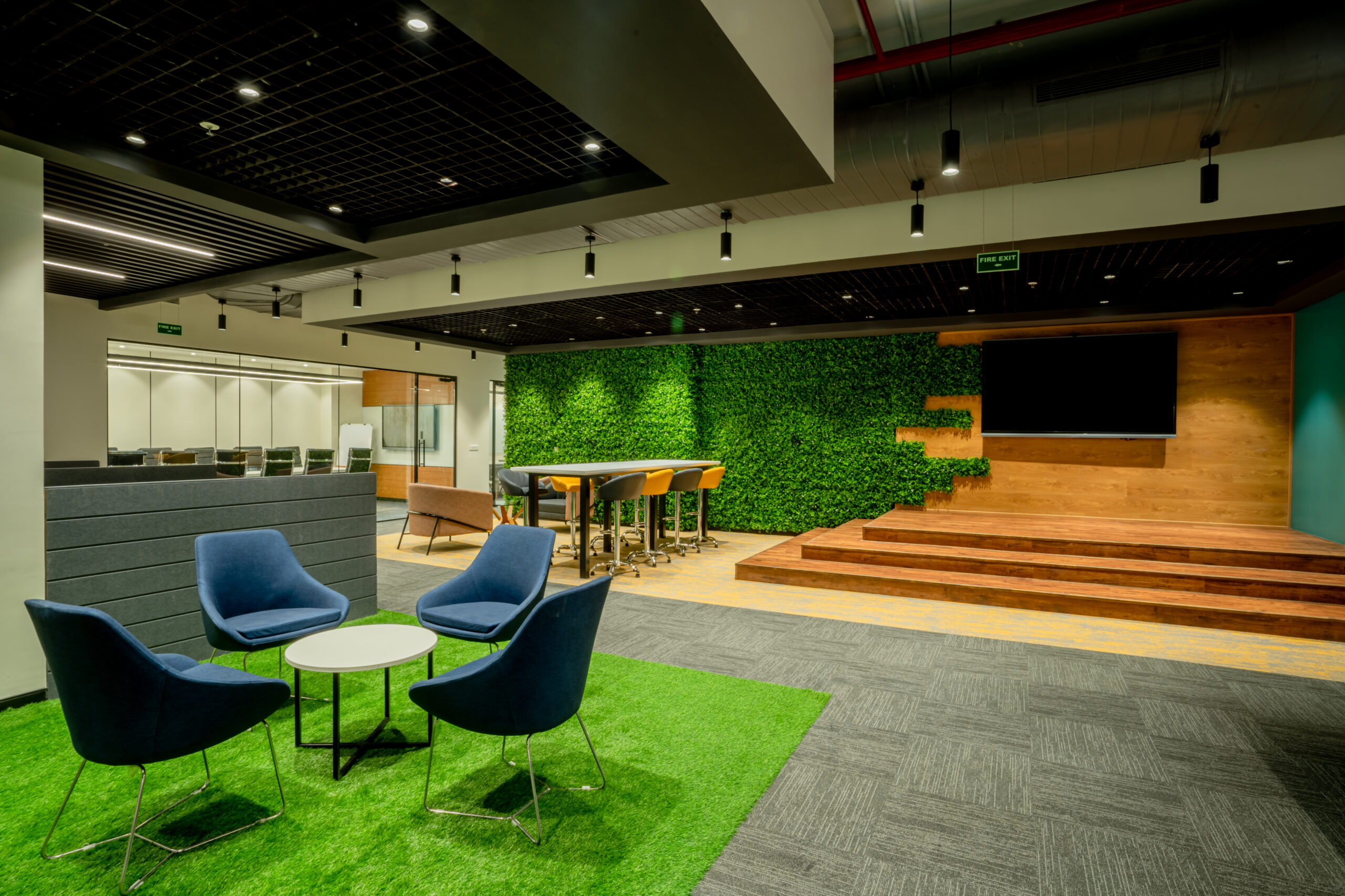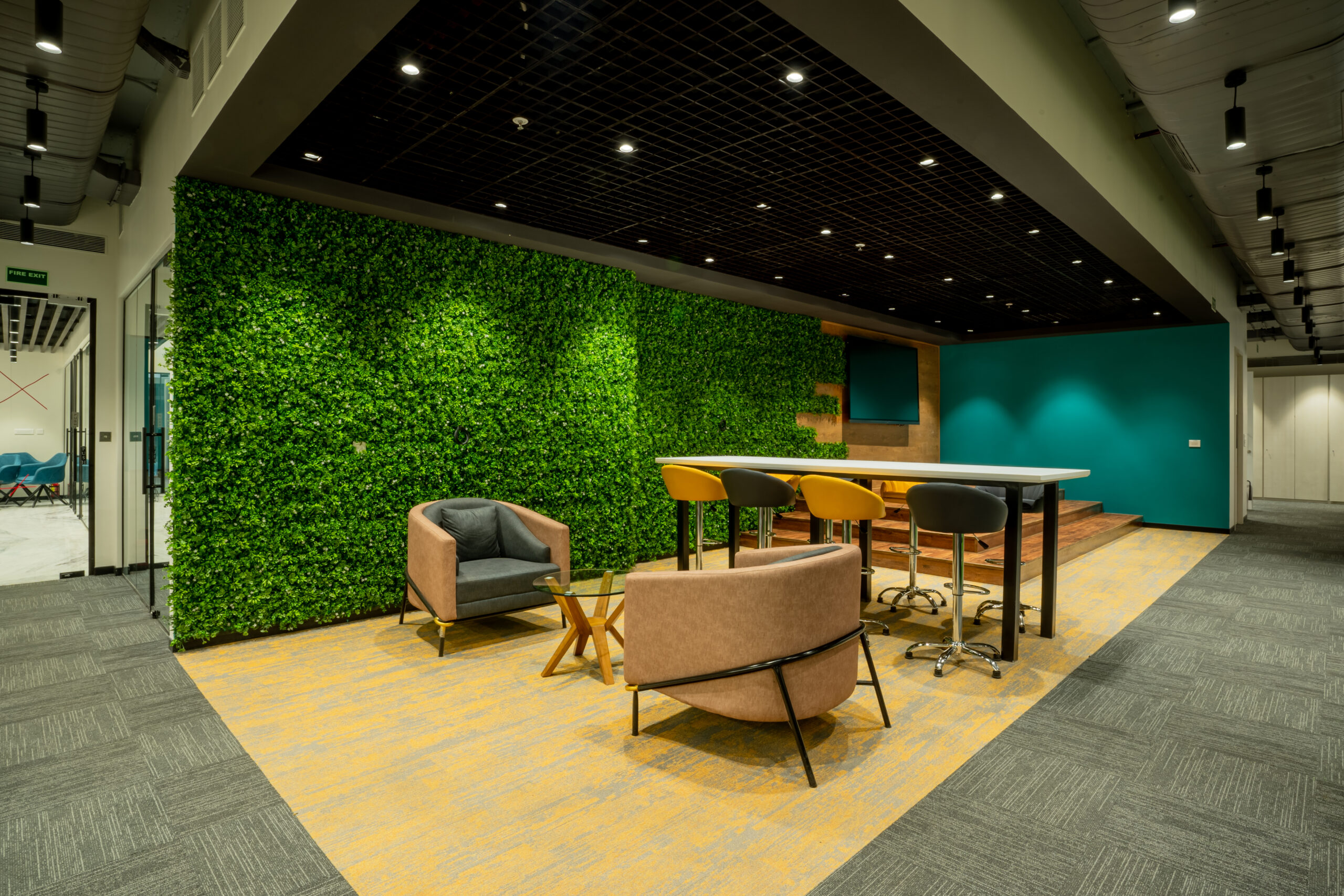 A flexible breakout area supports informal collaboration while allowing scope for future expansion. The interior language follows a contemporary palette of neutral tones with subtle teal accents, complemented by glass partitions and layered lighting that enhance transparency and spatial depth.