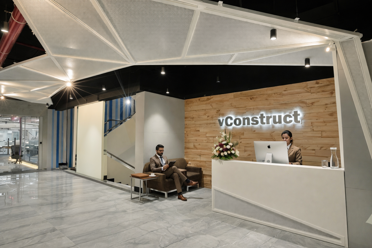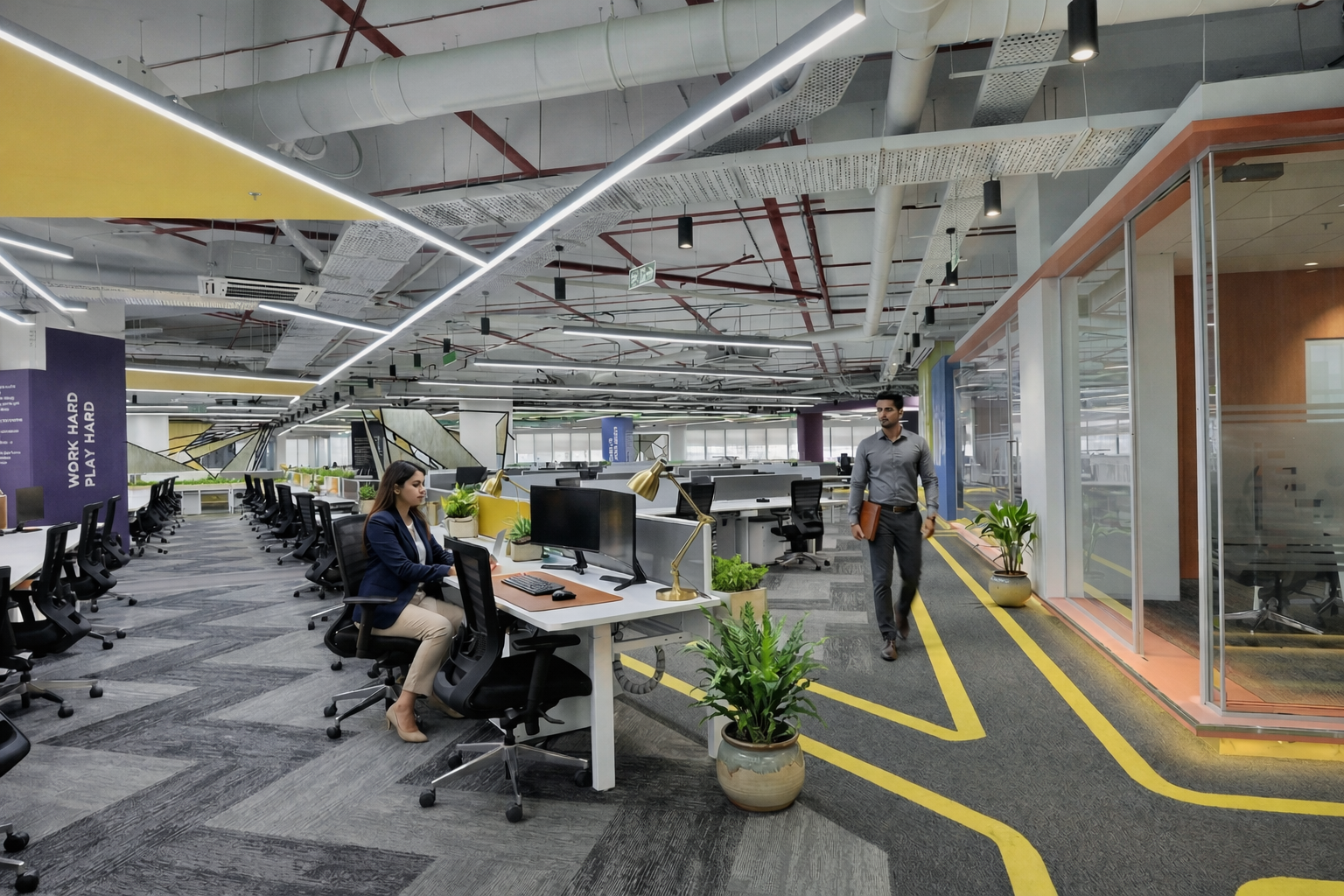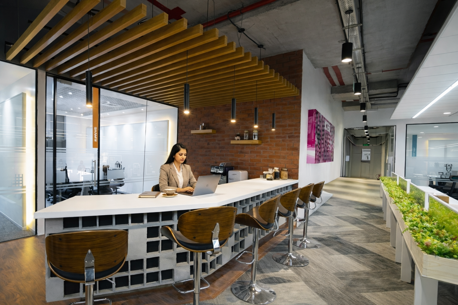 vConstruct’s Pune office is envisioned as a future-ready workspace that blends innovation with human-centric design. The concept focuses on creating a seamless flow between collaboration, focus, and relaxation zones through open planning, biophilic elements, and bold visual accents. A striking reception with integrated branding and greenery establishes identity, while dynamic lighting and ceiling features enhance spatial character. Workstations are designed for efficiency and flexibility, complemented by breakout areas that encourage creativity and interaction. Warm materials, clean lines, and intuitive circulation create a cohesive environment that reflects vConstruct’s forward-thinking ethos and commitment to productivity, well-being, and connected work culture.